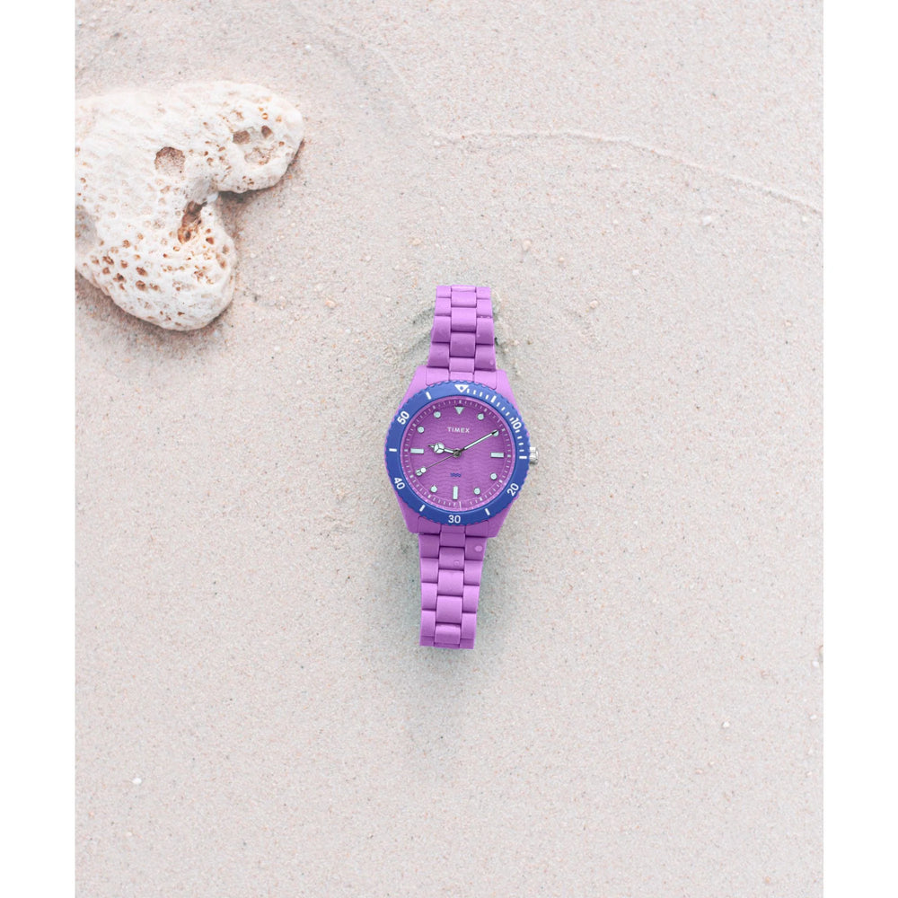 Built with a reliable quartz movement and a case, bracelet, and dial crafted from plastic that’s upcycled from ocean-bound waste, this watch puts sustainability at the forefront. Our partnership with #tide™ means its journey from waste to wrist® begins with fishermen collecting plastic from the coastlines; the waste is washed and shredded before making its way to Switzerland via carbon-neutral transportation; and finally, it’s repurposed on-site, resulting in a premium, sustainable material. The marine-inspired dial features a unique wave pattern, while the classic Timex Legacy construction itself honors our rich heritage in traditional watchmaking. Navigate uncharted waters ahead with all the trusted functionality you’d expect from a Timex—luminant hands and hour markers and 30m of water resistance—and join us in working toward a cleaner tomorrow.