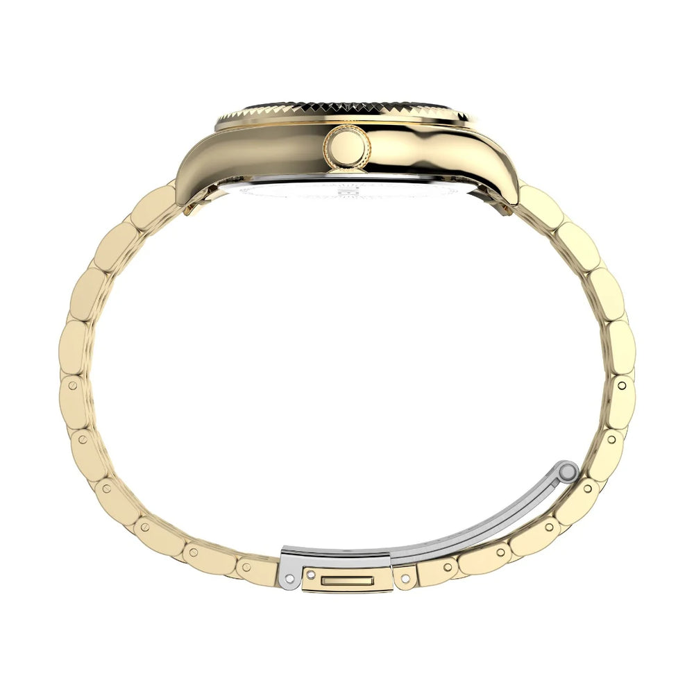 Amaze everyone around you by wearing this women's analog watch from Timex. The green round dial is protected by a mineral glass. It features plain 3-hand and a crown for time adjustment. The stainless steel strap comes in a gold hue that further elevates the look of the timekeeper. Besides, it is completed with a fold-over clasp with double push button safety clasp to ensure a secure fit on the wrist.