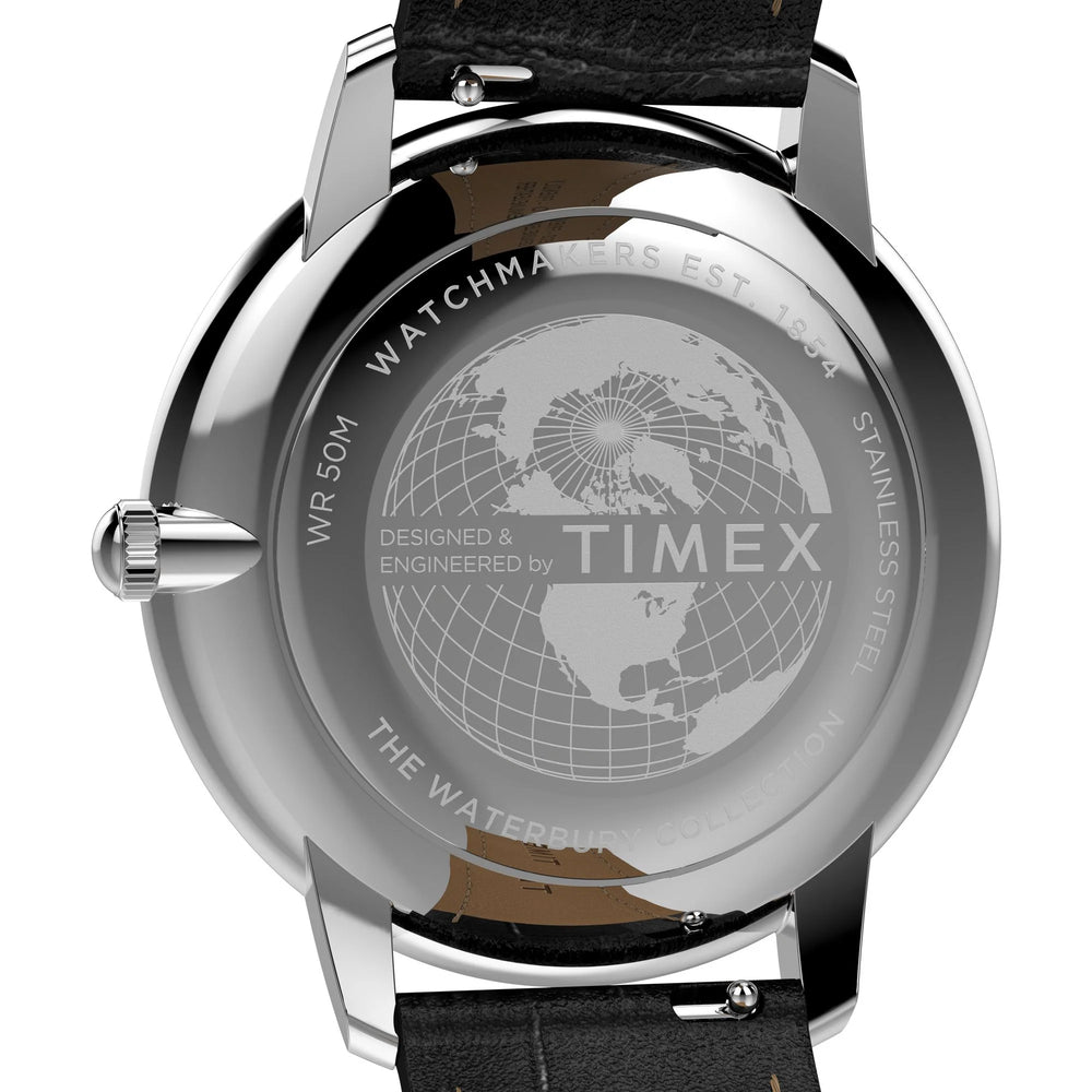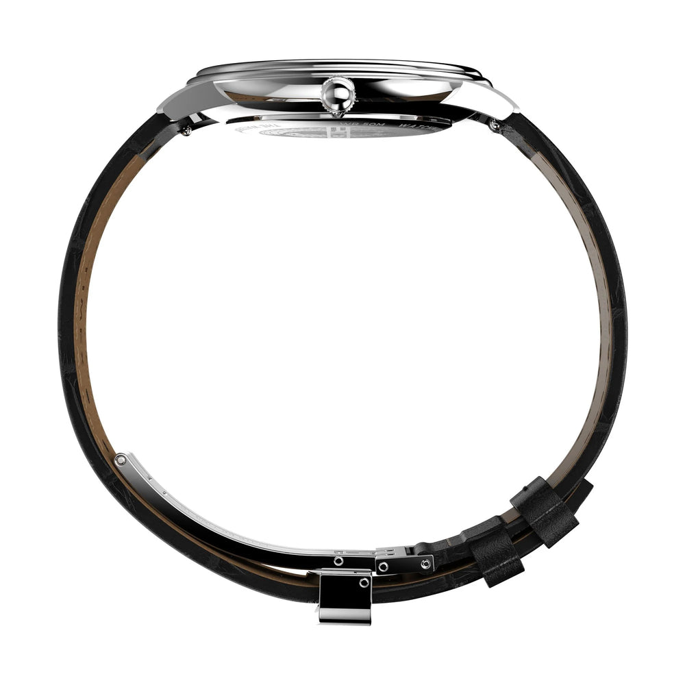 Defined by sharp lines and sweeping curves, the Waterbury Sub-second features an enhanced 39mm stainless-steel case with a slimmer profile and an elegant two-tiered bezel. Encircling the black dial are Roman numeral markers and a rail track, paired with a 24-hour format sub-dial just above 6 o’clock. This sophisticated timepiece is paired with a black natural leather strap ethically sourced from the Leather Working Group (LWG) and complete with an enticing crocodile grain and a deployant clasp.