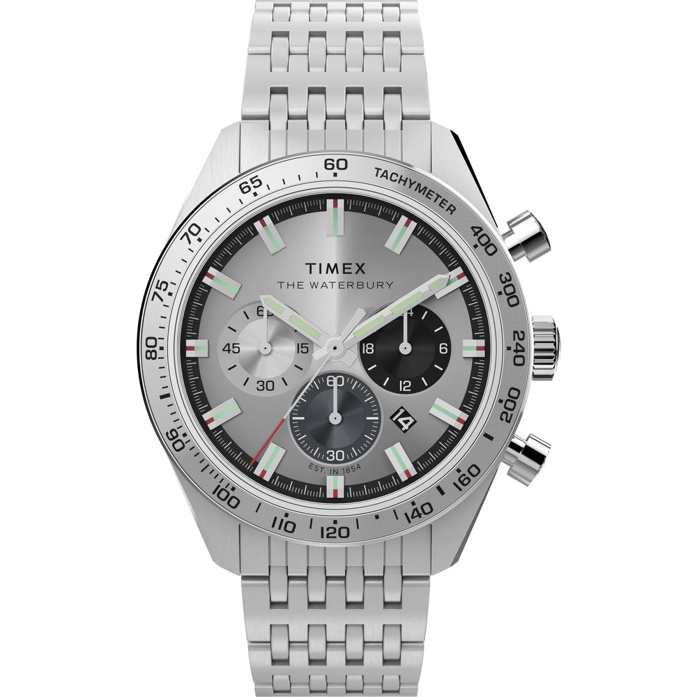Our Waterbury Traditional Chronograph is built with a sturdy 41mm stainless-steel case and equipped with a chronograph movement for tracking elapsed time and a tachymeter bezel for determining average speed. Unique tonal sub-dials bring an understated and sophisticated color contrast to its silver-tone dial, which houses a date window between 4 and 5 o’clock and bold hour markers punctuated by brilliant red. The crown proudly displays the Waterbury Watch Company logo, and the pushers are enhanced with a crosshatch texture. Opt for a totally stainless-steel look with a stainless-steel bracelet.