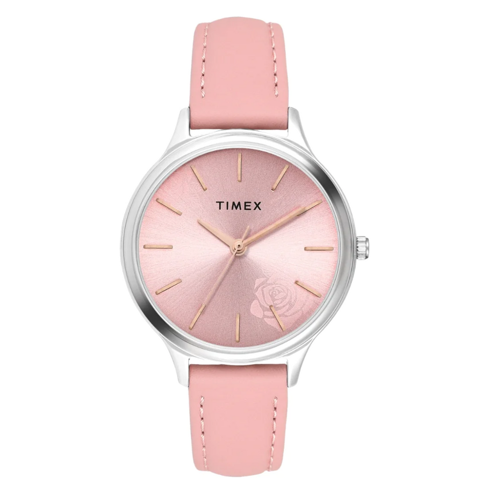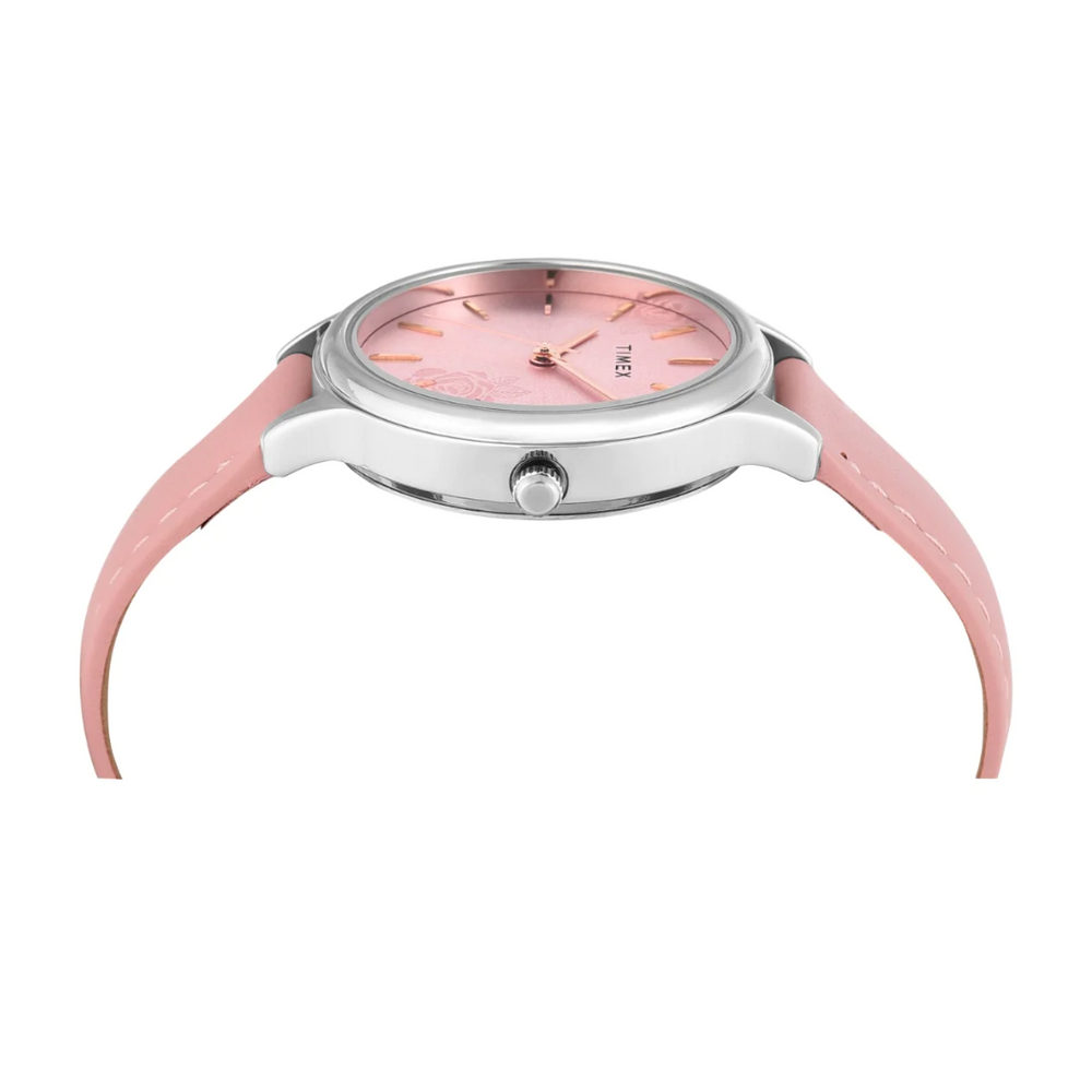 Stun everyone around you with this women's analog watch from Timex. Encased in a 34 mm case, the pink round dial features plain 3-hand functionality with a quartz movement. The genuine leather strap comes in a pink hue that further elevates the look of the watch. Besides, it has water resistance up to 30m and a buckle to ensure a secure fit on your wrists.
