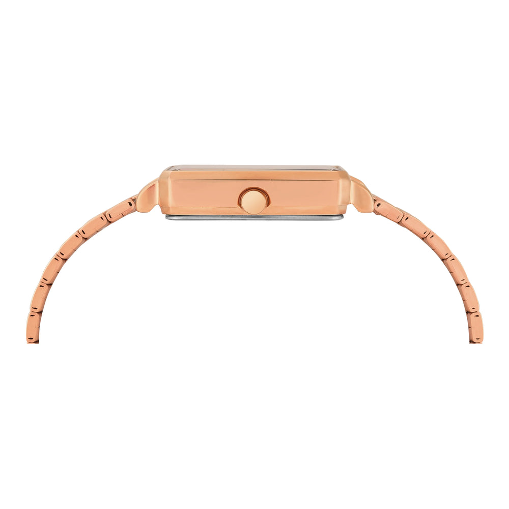 Infuse class to your OCCASION attire with this women's analog watch by Timex. Secured by a mineral glass, the Blue rectangular dial is nestled in a 23.5 mm case. It exhibits plain three hands. The stainless steel strap exudes a gold hue that accentuates the look of the watch. Moreover, it is equipped with a push-button clasp to ensure a secure fit on the wrist.