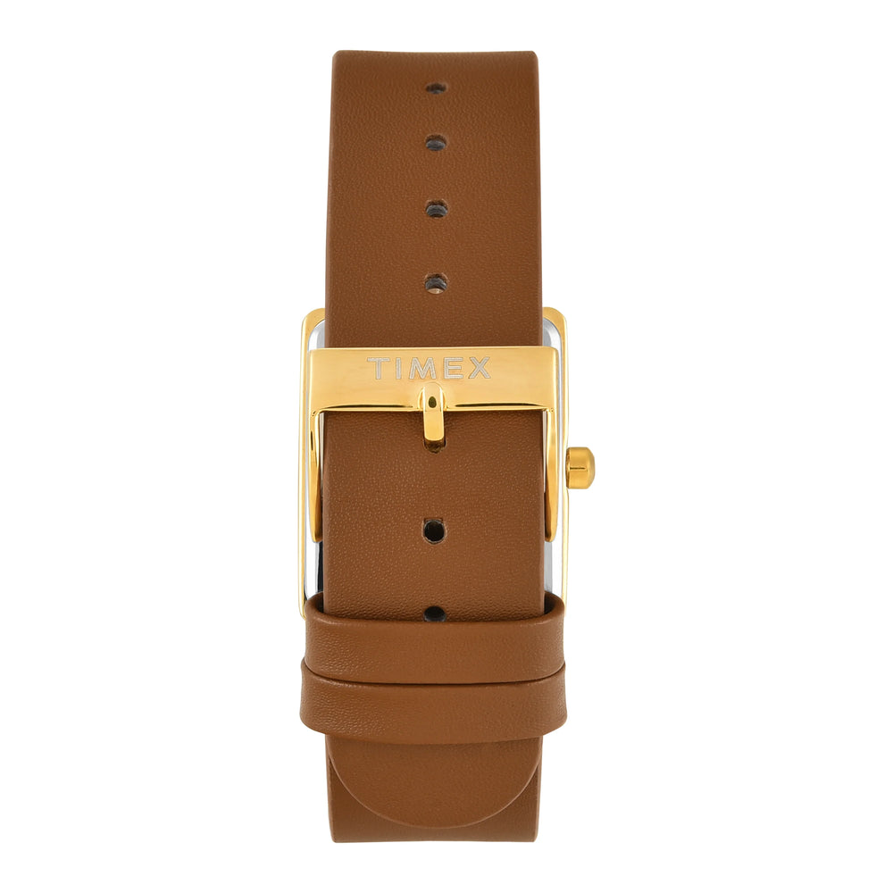 Look stylish by donning this women's analog watch by Timex. Its leather strap exudes a tan hue that accentuates the look of the watch. Safeguarded by a mineral glass and operated by a quartz movement, the white rectangular dial is encompassed in a 25.5 mm case. It features plain two hands. Furthermore, it is complemented with a buckle clasp that ensures a secure fit on the wrist.