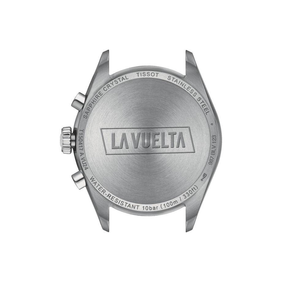The G10.212 chrono quartz movement within provides precision and robustness, complemented by water resistance up to 10 bar (100 meters/330 feet), and visibility in low-light conditions is guaranteed by the Super-LumiNova® coating on the needle-shaped hands. The caseback of this Grand Tour PR100 model is engraved with the respective logo of La Vuelta.