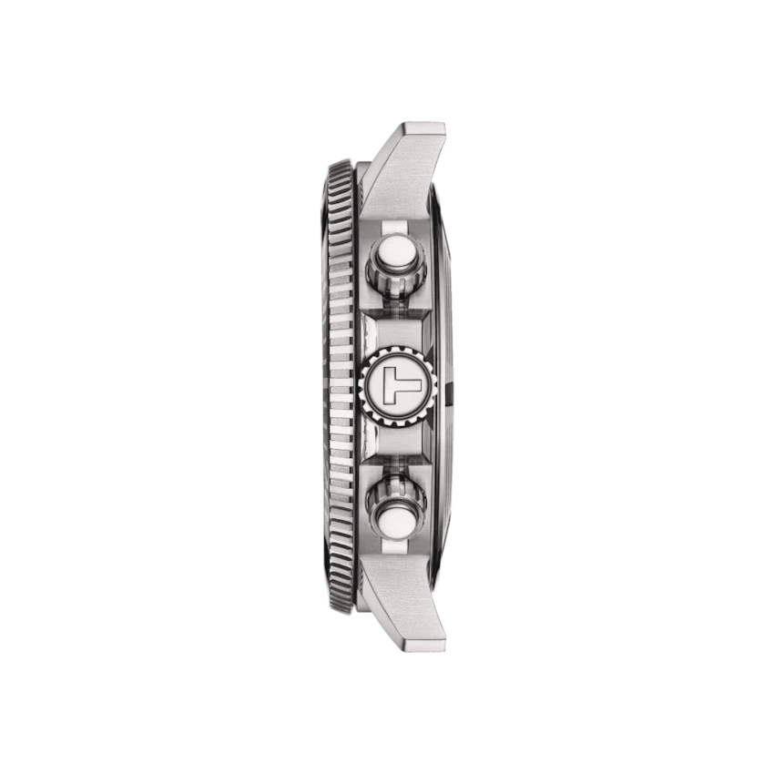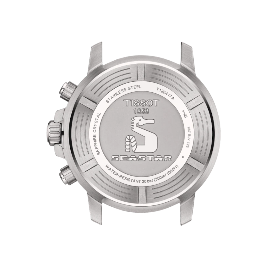 TISSOT SEASTAR 1000 QUARTZ CHRONOGRAPH T120.417.11.091.01 The Tissot Seastar 1000 Chronograph is the instinctive choice for water sports lovers. Its impressive water-resistance up to a pressure of 30 bar (300 m/1000 ft) is combined with the energy of a Swiss-made quartz movement. And features all the element required in a useful instrument: screw-down crown and case back, unidirectional steel bezel with aluminium ring and highly luminescent material for excellent readability in the dark. T1204171109101