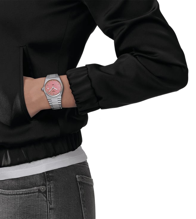 Look modish by donning this unisex's analog watch from the collection by TISSOT. The pink tonneau dial is protected by a sapphire glass. It features a crown for time adjustment. The stainless steel strap comes in a grey hue that further elevates the look of the timekeeper. Besides, it is completed with a push button clasp clasp to ensure a secure fit on the wrist.