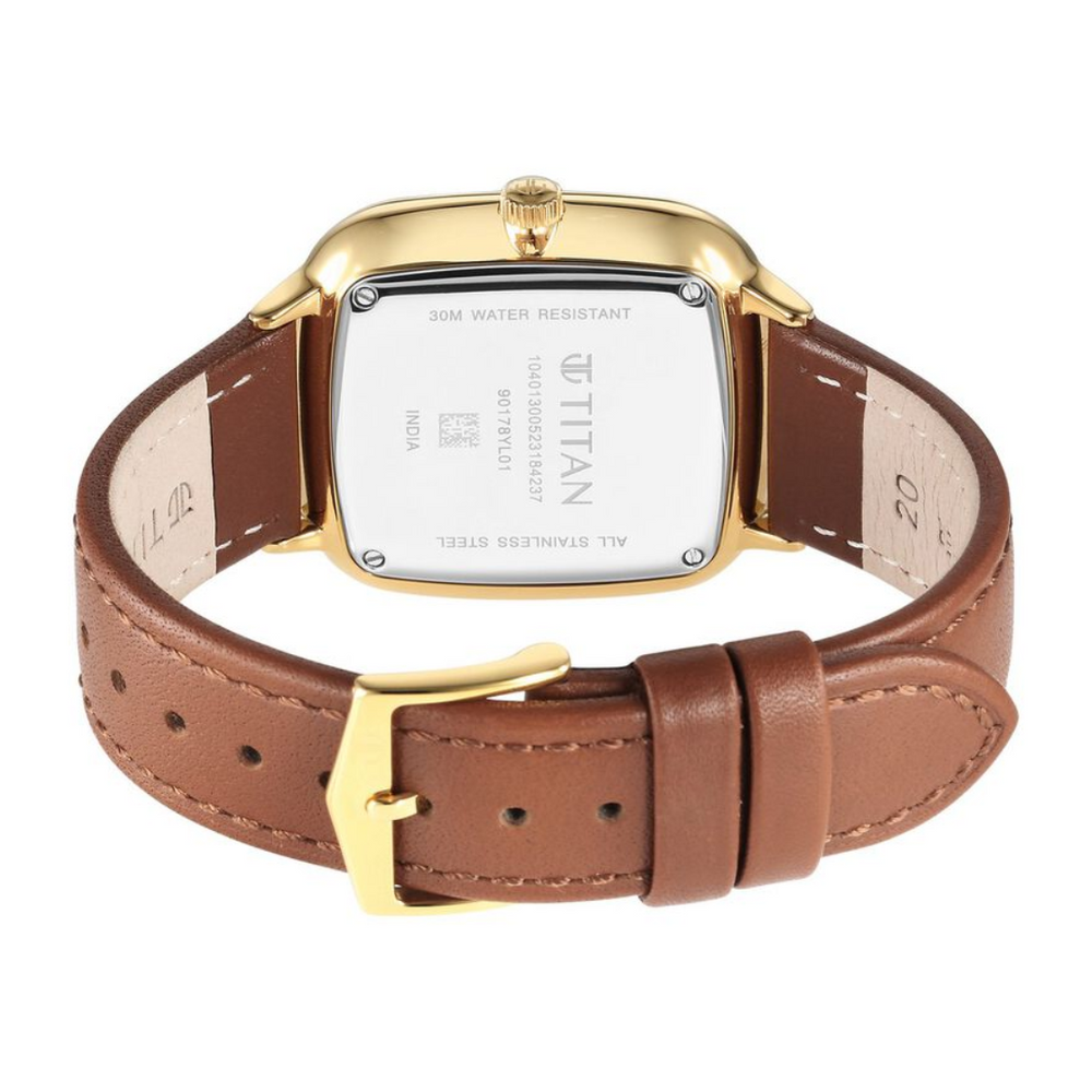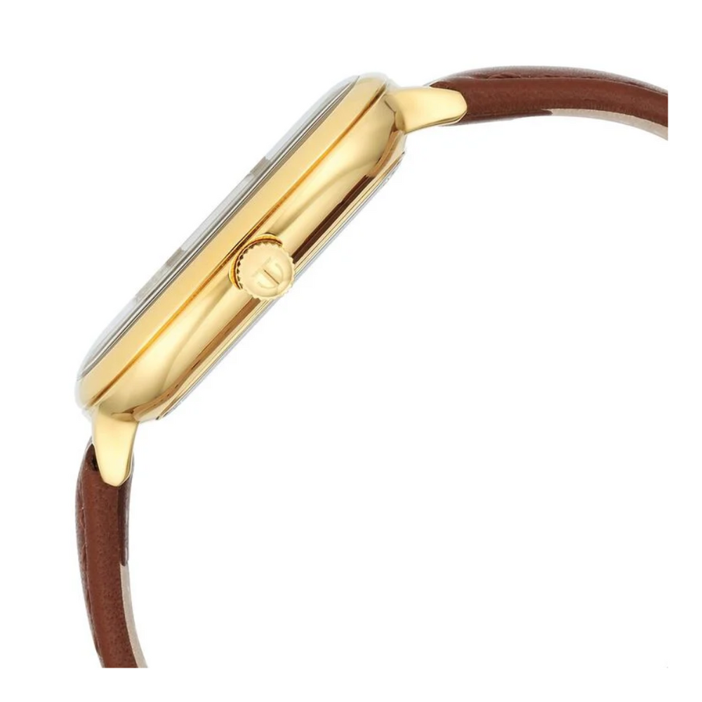 Experience classic charm with this brown and black combination timepiece. The sharp rectangle black dial, adorned with gold bezel detailing, features a subtle sheen and textured elements. Silver indices and gold hands complement two sub-dials for precise day and date tracking. The warm-toned brown leather strap ensures perfect comfort, making it an ideal accessory for all workwear.