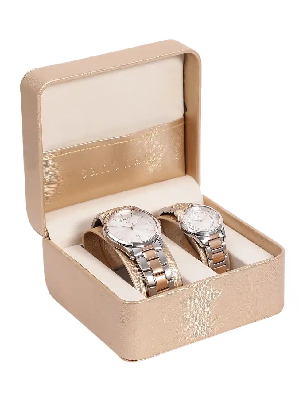 Elevate your love story with this pair of elegant his and her watches. The silvery dial, rose gold indices, and a dual-color strap create a bold and stylish accessory. For a coordinated look, wear them with complementary outfits; for instance, pair the his watch with a classic suit and the her watch with a chic cocktail dress for a romantic evening out.