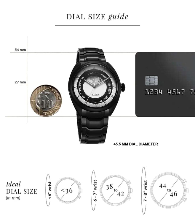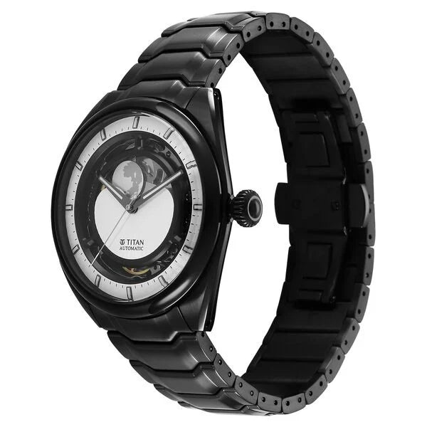 A must-have timepiece for all the watch aficionados, this men's Analog watch from the collection by Titan will be a perfect pick. The white round dial is protected by a Sapphire Glass. It features a crown for time adjustment. The stainless steel strap comes in a black hue that further elevates the look of the timekeeper. Besides, it is completed with a push button clasp to ensure a secure fit on the wrist.