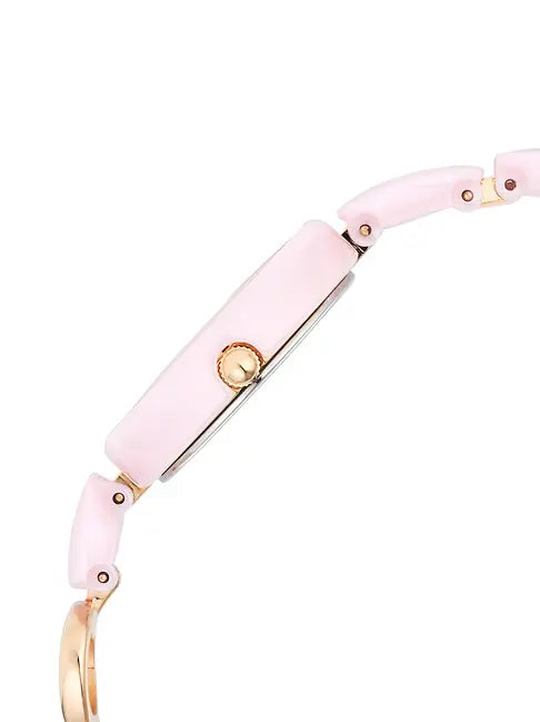 Everyone will appreciate your fine taste in style as you wear this women's analog watch from the Ceramics Upgrades collection by Titan. The pink round dial is secured by a sapphire glass and is functional on a quartz movement. It exudes plain three hands. The stainless steel strap vaunts a pink hue that enhances the look of the watch. Furthermore, it is completed with a jewellery clasp to ensure a secure fit on the wrist.