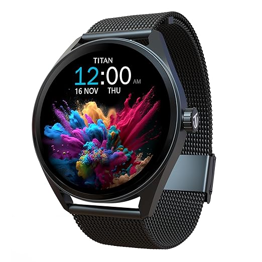 Titan Crest with 3.63 cm AMOLED Display with AOD, Functional Crown, BT Calling Smartwatch with Black Mesh Strap 90197am01