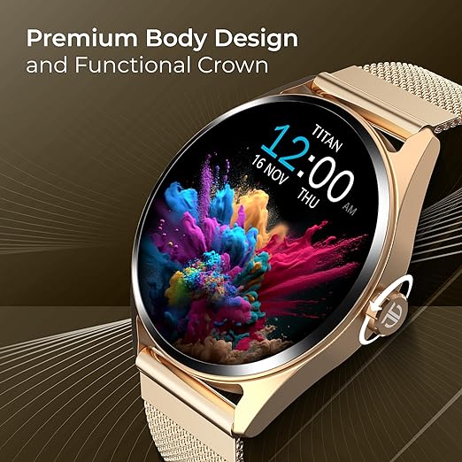 Titan Crest with 3.63 cm (1.43) AMOLED Display with AOD, 466 x 466 Pixel Resolution and Functional Crown. Advanced SingleSync BT Calling and 100+ Sports Modes. Enjoy Handy Features like Calculator, Calendar, In-Built Games, Music and Camera Control, Find Phone, Smart Notifications. Comprehensive Health Suite with Auto Stress Monitor, 24x7 HRM, SpO2 Monitor, Sleep Monitor with REM, Breathe Exercise.