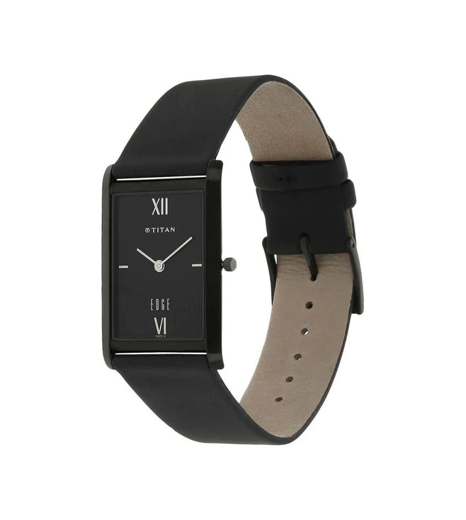 Merging contemporary style with performance, this men's analog watch from the Edge collection by Titan will lend you a modish look. The black rectangular dial is encased in a 38 mm case. It exudes plain two hands and a crown for time adjustment. The genuine leather strap exudes a black hue that accentuates the look of the watch. Besides, it is completed with a buckle clasp to ensure a secure fit on the wrist. This water-resistant watch will be your timeless possession.