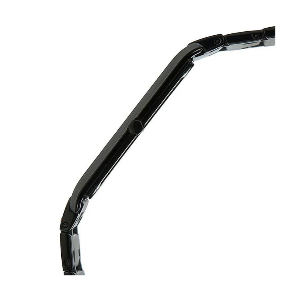 Sophistication meets style in this rectangular black dial analog watch for men. Encased in black stainless steel, it boasts Arabic numerals and slanted markings, while the black stainless steel strap adds to its sleekness. Water-resistant up to 3 ATM, this watch is a user-friendly accessory. Elevate your office look by pairing it with a crisp white dress shirt, black tailored trousers, and polished black leather shoes for a monochromatic theme that exudes professionalism.
