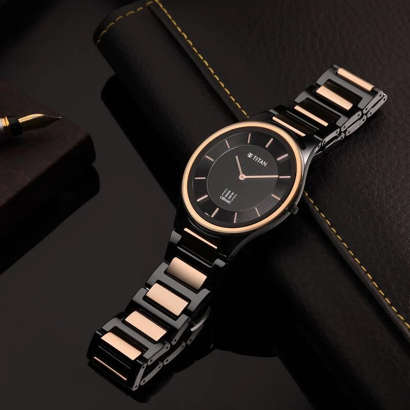 Titan Edge Ceramic Quartz in Midnight Gold with Black Dial Watch for Men 1696KC01