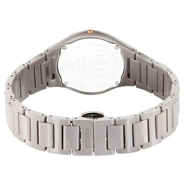 The Titan Edge Ceramic is a sophisticated timepiece, designed for those who appreciate sleek, contemporary style. Powered by the precise T9081 in-house calibre, this watch combines elegance with functionality. Crafted from premium ceramic, the case is known for its scratch-resistant properties, ensuring durability without compromising on style. Its slim design, with a thickness of just 4.4 mm, enhances comfort and adds to its refined look. The watch is fitted with a beige ceramic strap featuring a glossy finish, which integrates seamlessly with the case for a cohesive design. The black dial, protected by scratch-resistant sapphire crystal, features minimalist rose gold accents on the bezel, including sleek hands and indices, which add a touch of luxury. A key feature is its water resistance of up to 30 meters, making it suitable for everyday wear while retaining its elegant appeal. This watch is perfect for those who seek a stylish, lightweight watch that transitions effortlessly from casual to formal settings