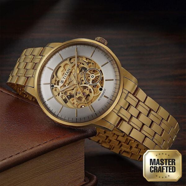 Embrace the brilliance of gold with the Titan Golden Heart Skeletal Automatic. Its open-worked dial reveals the intricate automatic movement, accentuated by gilded details that exude refinement. A golden-tone bezel and gold-accented indices amplify its opulent charm, while two striking variants-a stainless steel bracelet with gold accents and an all-gold finish-offer versatile sophistication. Designed for those who appreciate timeless luxury, this watch shines at formal events, celebrations, and elegant soirees. Powered by a 21-jewel automatic movement with a 42-hour reserve, it's a statement of elegance in perpetual motion.