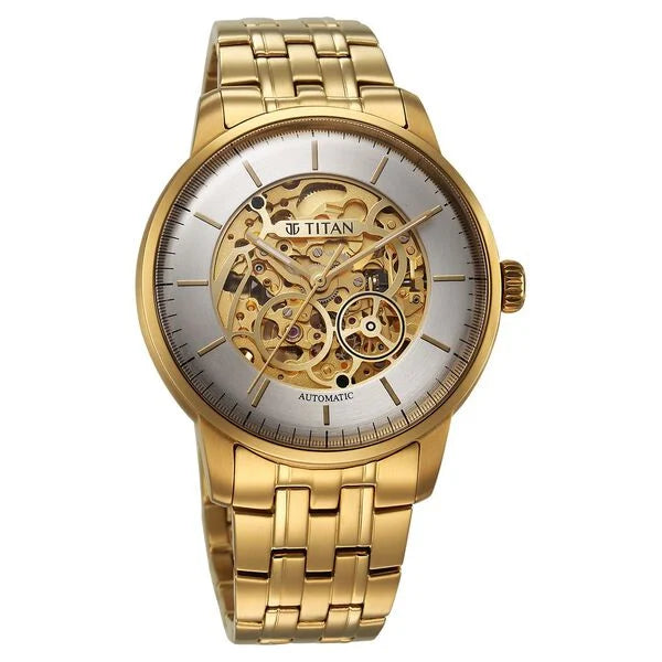 Titan Golden Heart Skeletal Automatic Analog with Silver Dial Yellow Gold Stainless Steel Strap Watch for Men 90110ym01