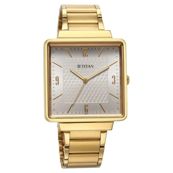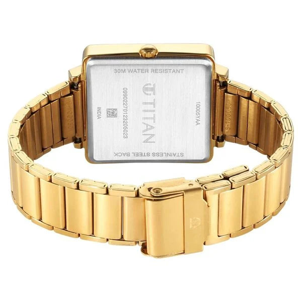 Own this men's analog watch from Titan and keep yourself updated with the latest trends. Created in a stylish design, this accessory comes with a golden stainless steel strap that lends a sophisticated look. The golden dial vaunts an aperture that enhances the look of the dial. This water resistant watch can be teamed with a pair of trousers and a white shirt to complete your look for the day.