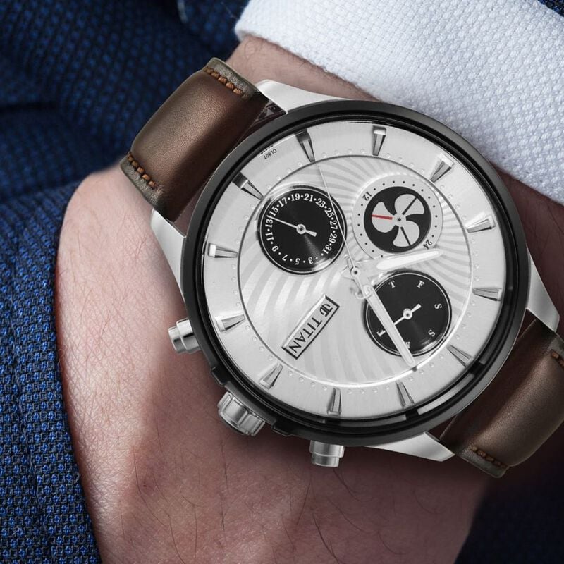 Celebrate majestic wonders with the blade watch from Titan Maritime, a collection inspired by seafarers and their adventorous voyages. The white dial and the 24hr counter takes inspiration from the propeller while the crown is inspired by the porthole. Added to it is a brown leather strap that integrates the look to form an enchanting piece. Style it with a crisp white shirt or brown blazer to form a smart cohesive look.