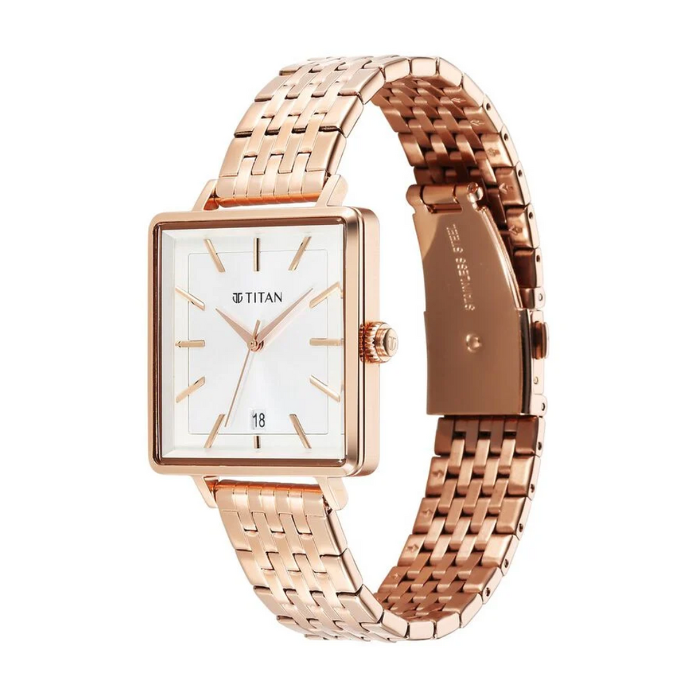 Titan Minimalists Quartz Analog with Date Silver Dial Rose Gold Stainless Steel Strap Watch for Women