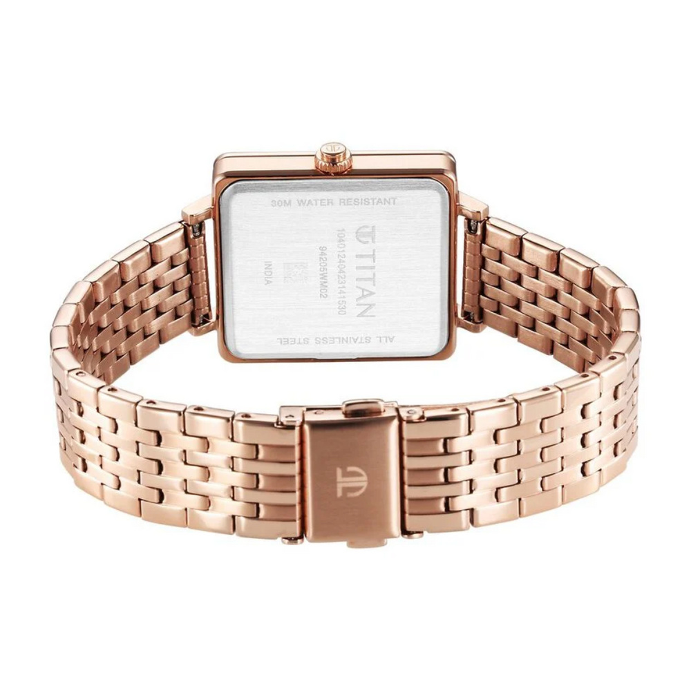 The stainless steel bracelet comes in a rose gold hue that further elevates the look of the watch. Besides, it is water-resistant up to 30m and is completed with a hook buckle to ensure a secure fit on the wrist.Entrance everyone with this women's analog watch from the Minimalists collection by Titan. Encased in a 30 mm case, the silver rectangular dial features plain 3-hand functionality and quartz movement on the watch.