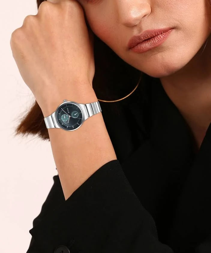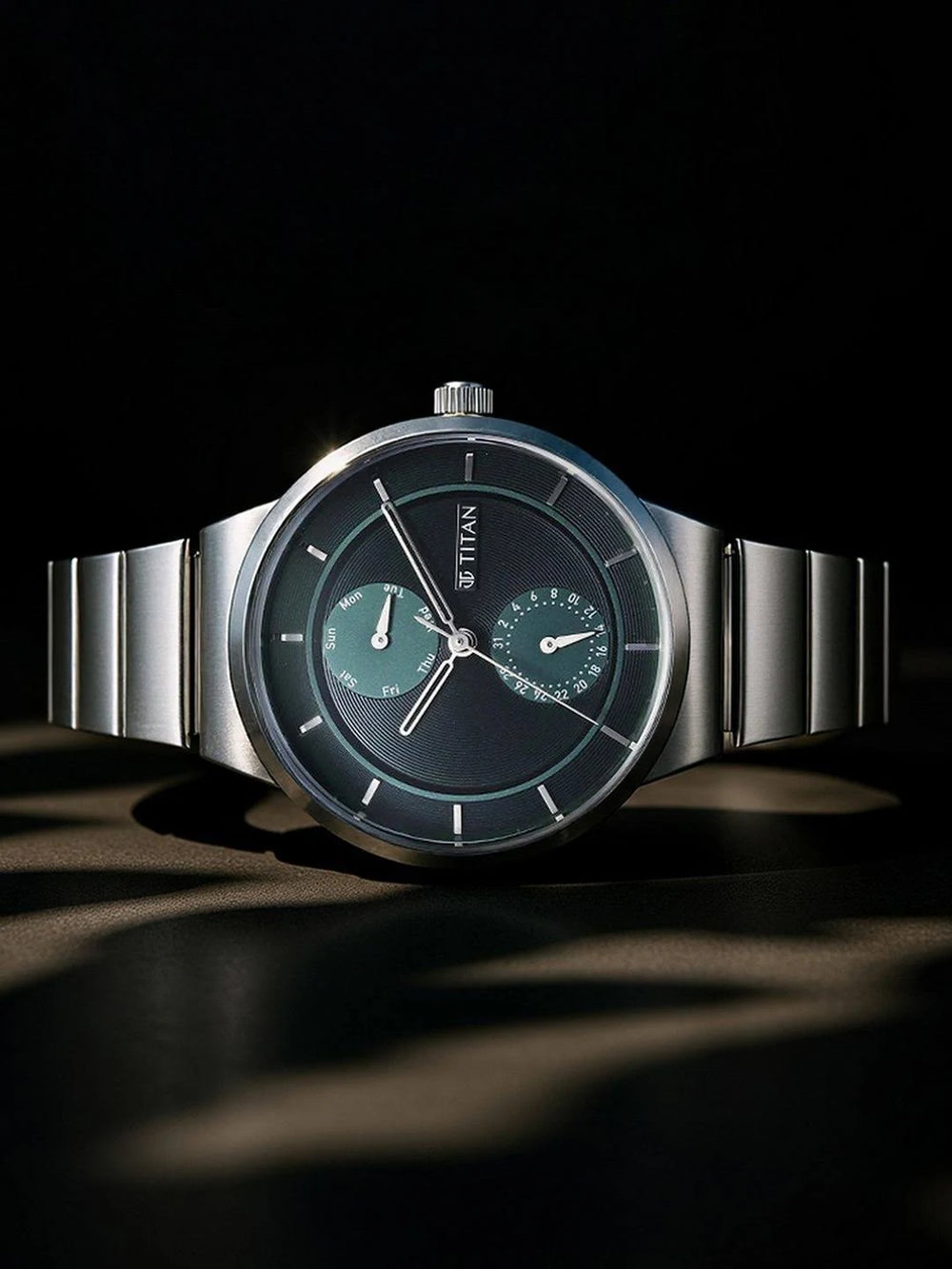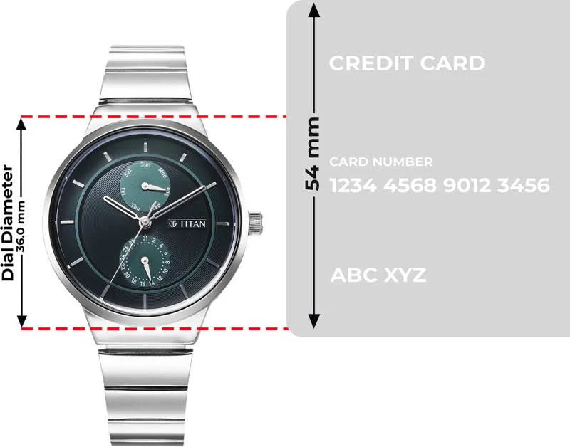 Style and performance perfectly combine together to form this women's analog watch that is brought to you by the Neo 10 collection by Titan. Operated by a quartz movement and safeguarded by a sapphire glass, the green round dial is encased in a 42.15 mm case. It features plain three hands. The stainless steel strap comes in a silver hue that further elevates the look of the timepiece. Moreover, it is fitted with a push-button clasp to ensure a secure fit on the wrist.