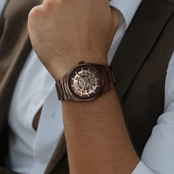 Navigate time with precision and style with the Titan Nexus Skeletal Automatic. Inspired by a ship's helm, its open-worked dial symbolizes movement and progress, offering a captivating view of the intricate 21-jewel automatic movement with a 42-hour reserve. Available in striking brown monochromatic finish, its integrated bracelet ensures a seamless, contemporary fit. Luminous hands, applied indices, and a minute ring enhance legibility, making this timepiece a refined companion for those who chart their own course.