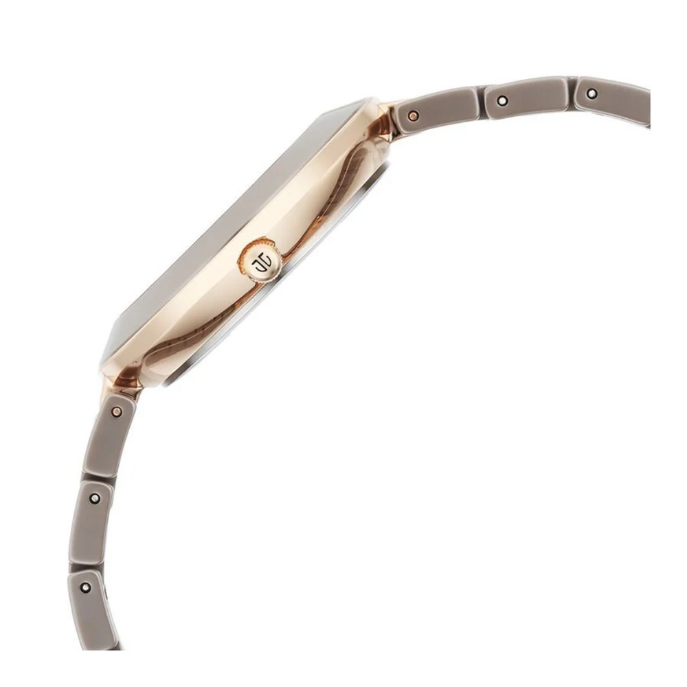 Illuminate your presence with this analog watch from Titan. Encased in a 35 mm case, the brown round-shaped dial also features plain 3-hand functionality, quartz movement and a crown for time adjustment. The ceramic bracelet comes in a grey hue that further elevates the look of the watch. Besides, it has a water resistance of up to 50 m and is completed with a fold-over clasp with a hidden single push button to ensure a secure fit on the wrist.
