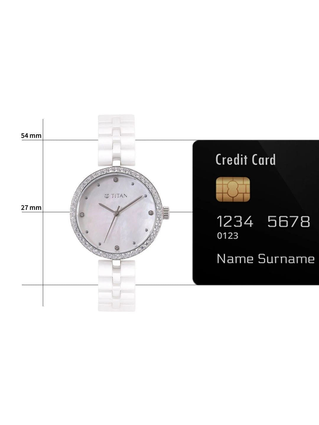 Add a stylish dimension to your look by wearing this women's analog watch from the Purple Ceramics collection by Titan. Covered by a , the mother of pearl round dial is nestled in a 34 mm case. It vaunts plain three hands. The ceramic strap exudes a white hue that accentuates the look of the watch. Moreover, it is fitted with a deployment clasp with push button clasp that ensures a secure fit on the wrist.