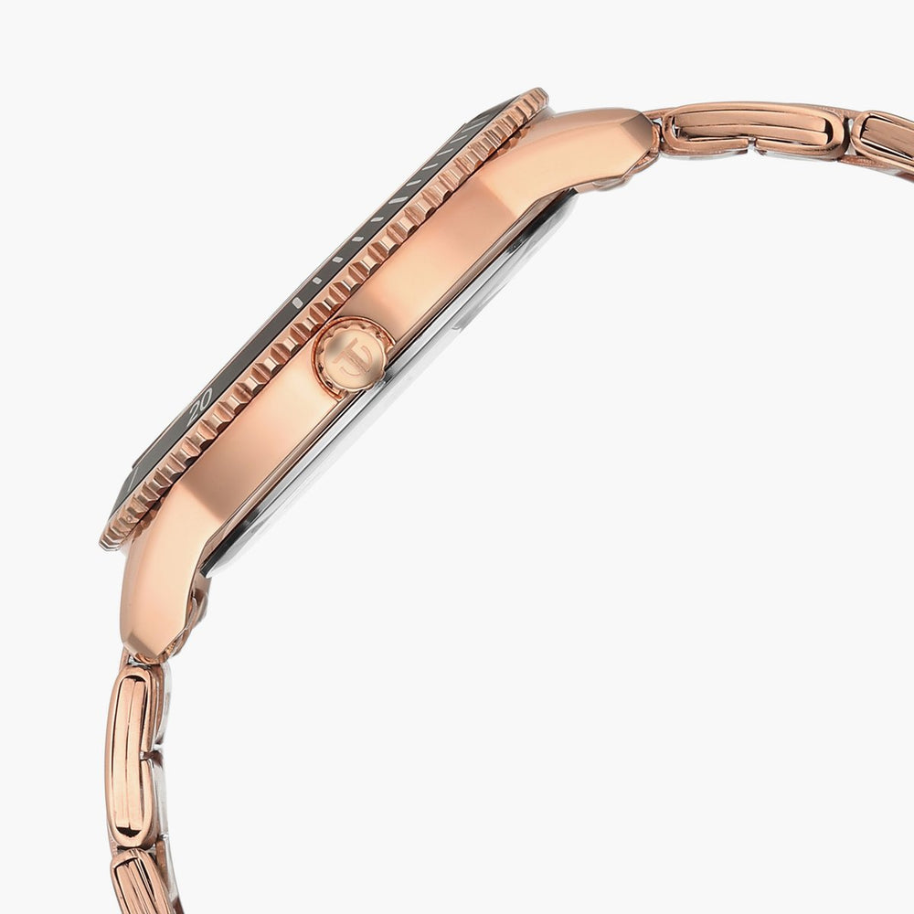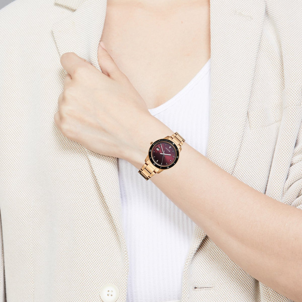 Round dial analog watch with stone and triangle hour markers, a date window at 3 o'clock, and 50m water resistance. Features a stainless steel b raceelt strap with a push button deployant clasp.