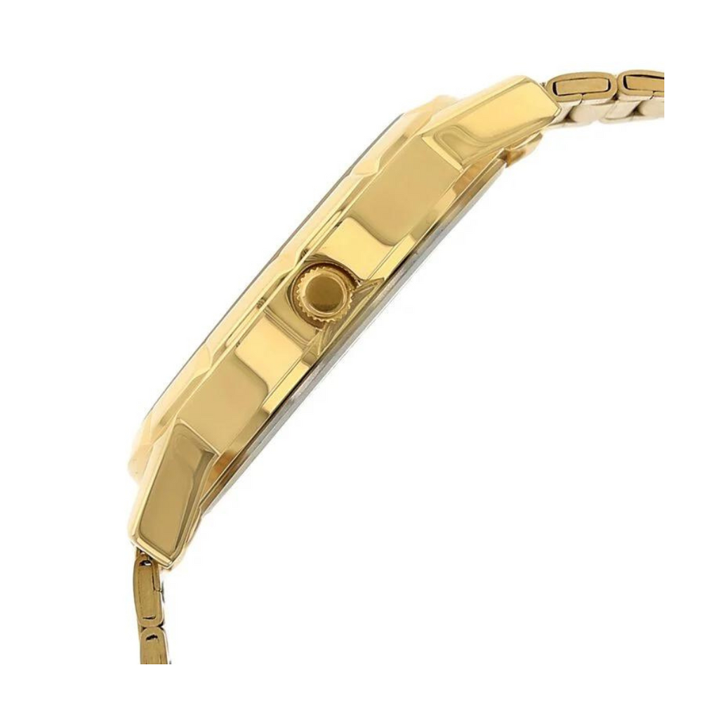 This analog watch for men features a round silver dial, encompassed within a Metal case. The dial has Arabic numerals at the five minute intervals and three plain hands. Its gold strap comes with a sliding closure. A gold yellow crown lets you adjust the time.