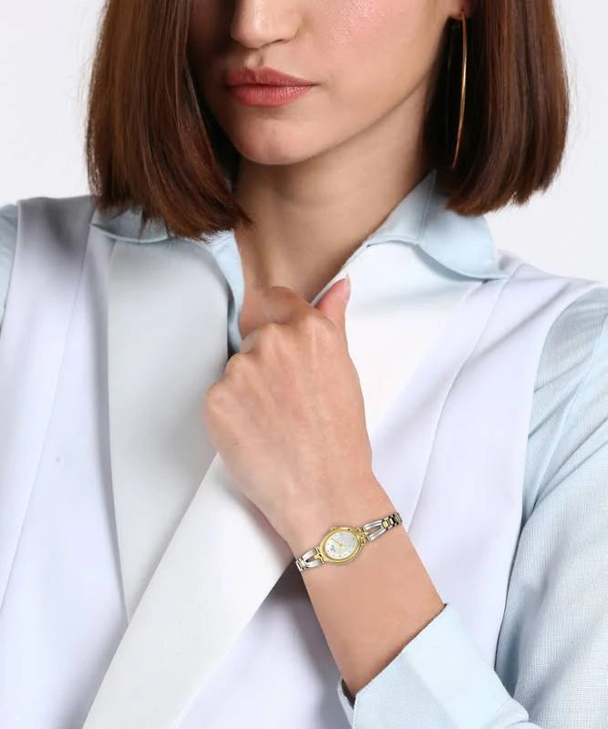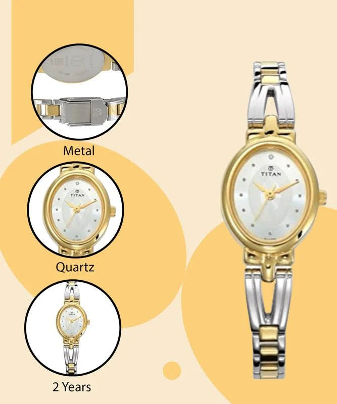 Occupy the centre stage at every crowd by wearing this glistening watch from the Titan Karishma collection. The watch comes with a special shaped silver colour dial and has a unique de-plated design pattern. The dial also comes with a studded crystal which gives the watch a royal look. The golden colour case and the glossy finish on it elevate the style equation. The two-toned half kada stainless steel strap is a mark of beauty and makes this watch a perfect choice for women. This analog watch comes with a 24 month warranty.
