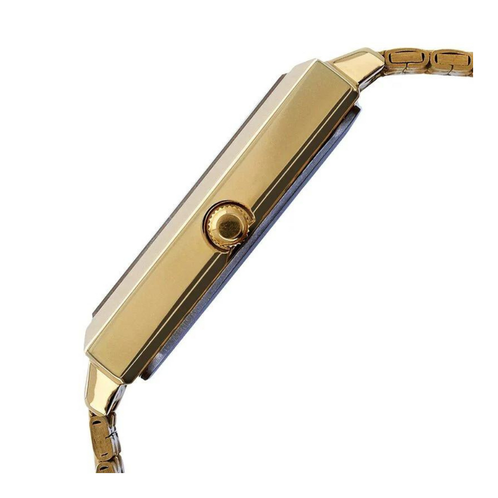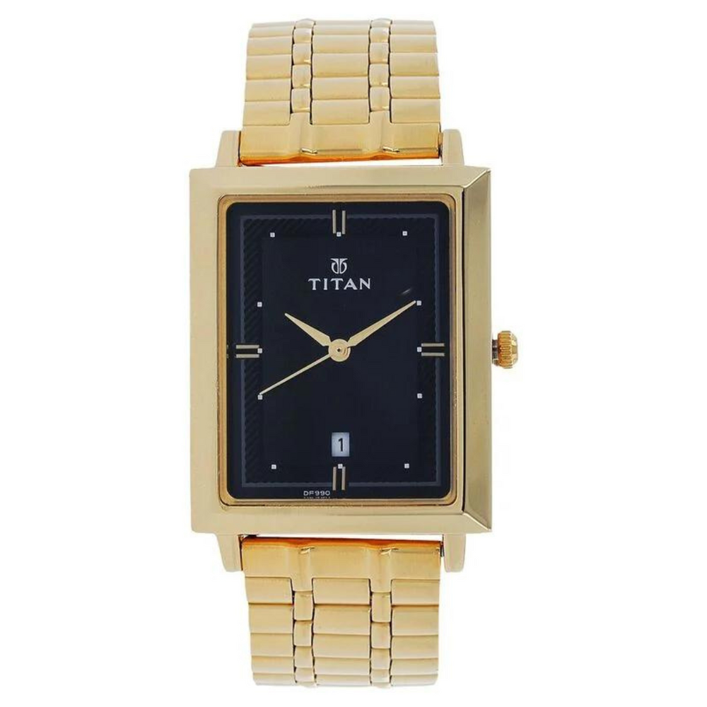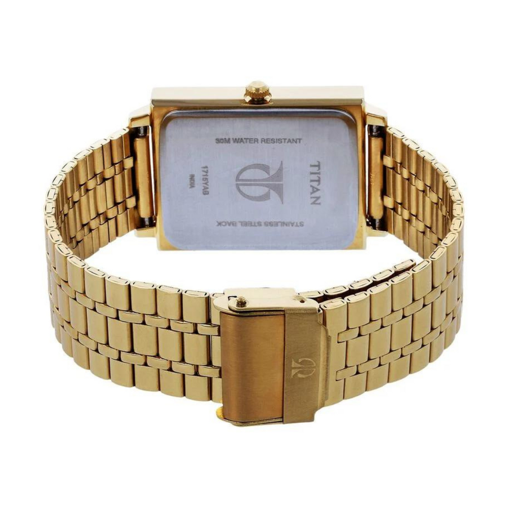 Add a tinge of subtlety to your look with this formal men's analog watch from Titan's Karishma collection. This timepiece showcases a stunning black rectangular dial that runs on a quartz movement. The strap is made of high quality stainless steel and comes in a golden hue. Team it with a blue shirt to make a style statement.