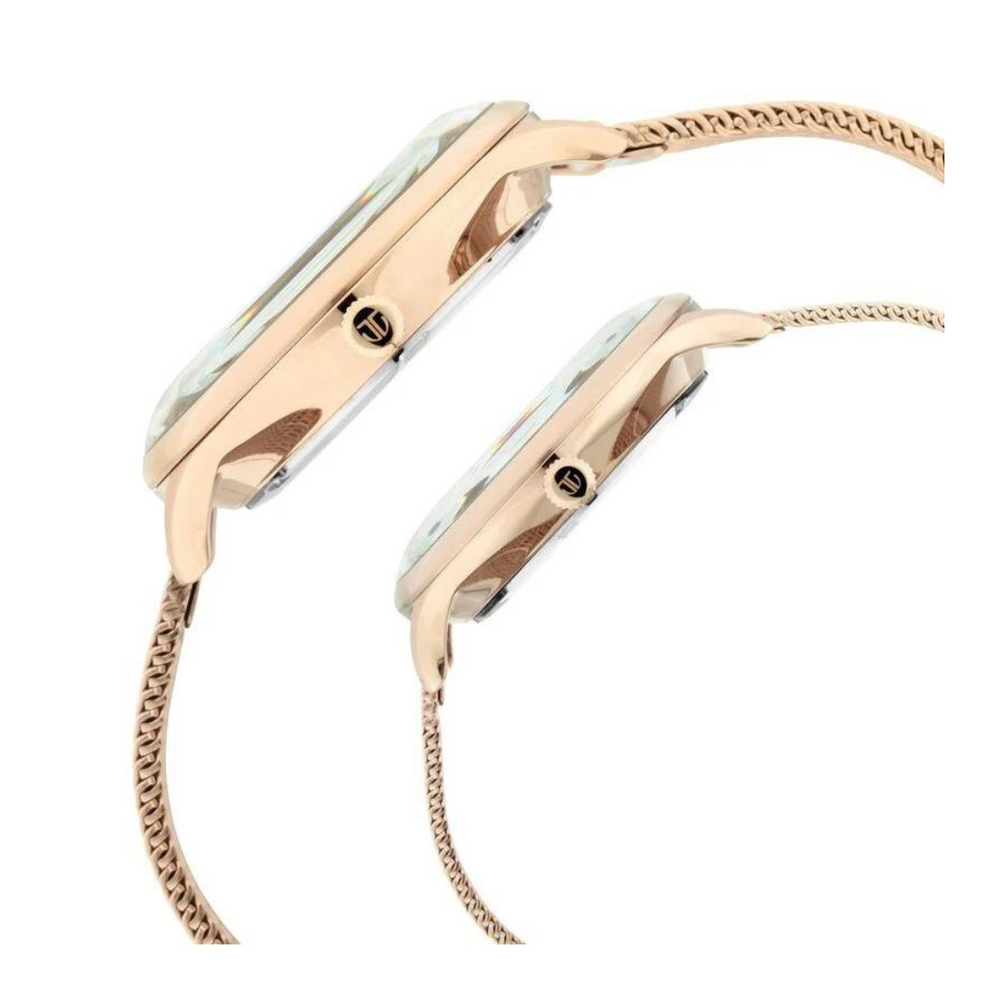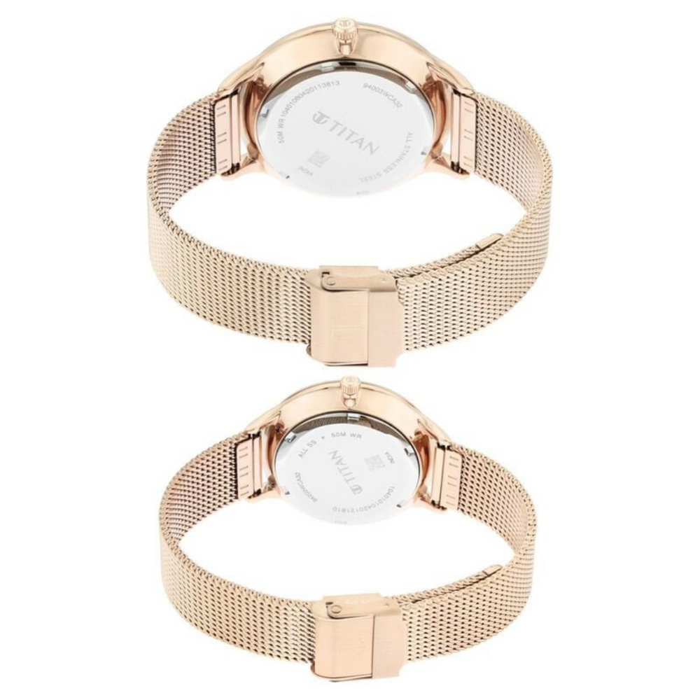 Experience the best things in pairs with this enchanting set of two watches from the Bandhan Collection. The cambered dials with domed mineral glass and carnation gold plated mesh straps create an elegant look. Whether you're attending a special occasion or having a casual day out, these watches complement your everyday style. Coordinate your outfits for a cohesive and stylish appearance.
