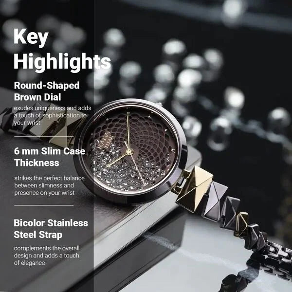Make a statement at special occasions with this stunning Raga watch. The rich brown color, flower stencil design on the dial, and a rectangular 3D bracelet with a color gradient create a captivating look. Pair it with elegant dresses or ethnic wear to enhance your overall presenc