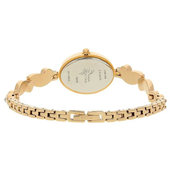 Turn heads with this women's analog watch from the Raga Foliage collection by Titan. Encased in a 14.3 mm case, the rose gold oval dial features plain 2-hand functionality and quartz movement on the watch. The brass bracelet comes in a rose gold hue that further elevates the look of the watch. Besides, it is water resistant up to 30 m and is completed with a jewellery clasp to ensure a secure fit on the wrist.