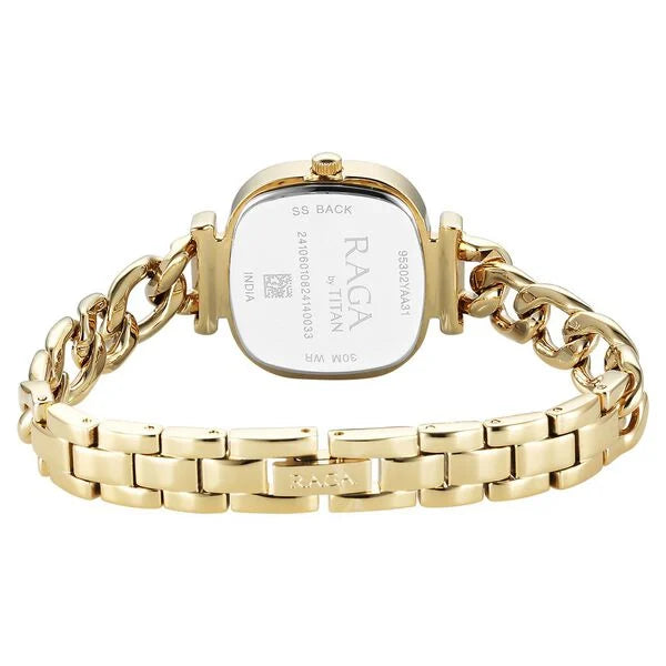 Fusing contemporary style with functionality, this women's analog watch from the Raga Show Stopper-2.0 collection by Titan is specially made for all the watch aficionados. Protected by a sapphire glass, the maroon carre dial is functional on a quartz movement. It vaunts plain three hands. The brass strap showcases a rose gold hue that uplifts the look of the watch. Moreover, it is fitted with a jewellery clasp to ensure a secure fit on the wrist.
