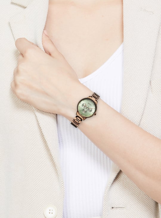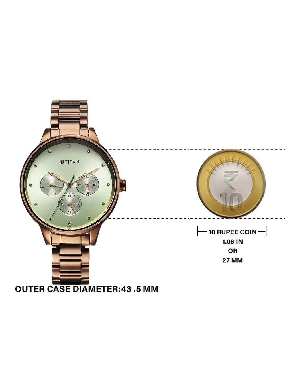 Set your fashion parameters high with this women's analog watch from the Razzle Dazzle Phase 1 collection by Titan. Protected by a sapphire glass, the green round dial is housed in a 43.5 mm case. It exudes plain three hands. The stainless steel strap vaunts a brown hue that enhances the look of the watch. Moreover, it is fitted with a push-button clasp that ensures a secure fit on the wrist.