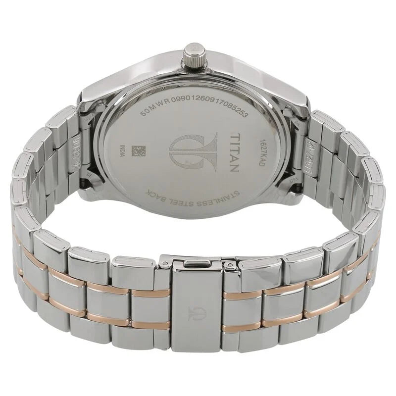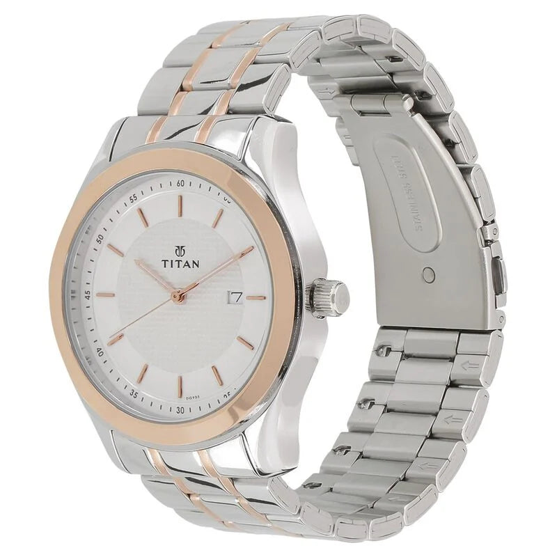 Elevate your style with this distinct Titan Regalia Baron watch featuring a bimetal rose gold and silver strap and a matching white-colored dial. For a refined and sophisticated look, pair it with a cream-colored tailored blouse, a rose gold pleated skirt, and rose gold heels. Let this watch be the epitome of timeless elegance in your ensemble.