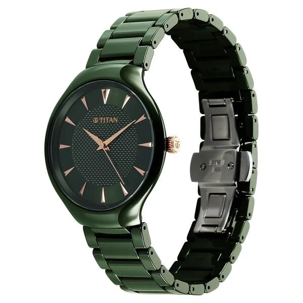 Add a stylish dimension to your look by wearing this men's Analog watch from the collection by Titan. The green round dial is protected by a Sapphire Glass. It features a crown for time adjustment. The ceramic strap comes in a green hue that further elevates the look of the timekeeper. Besides, it is completed with a push button clasp to ensure a secure fit on the wrist.