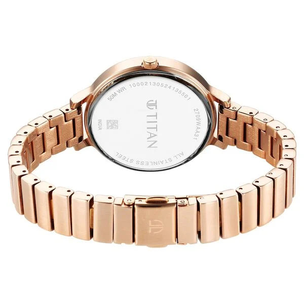 A perfect pick for every watch lover, this women's analog watch from the Purple Secluded collection by Titan blends functionality with modern day style. Its brass strap comes in a rose gold hue that elevates the look of the watch. Housed in a 43.2 mm case, the blue round dial is protected by a . It showcases plain three hands, DETAILS and a crown for time adjustment. Furthermore, it is complemented with a push-button clasp to ensure a secure fit on the wrist.
