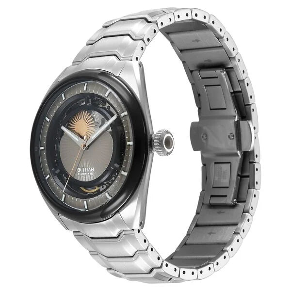 Titan Stellar Automatic Sun Moon Phase Grey Dial Stainless Steel Strap Watch For Men 10011km01