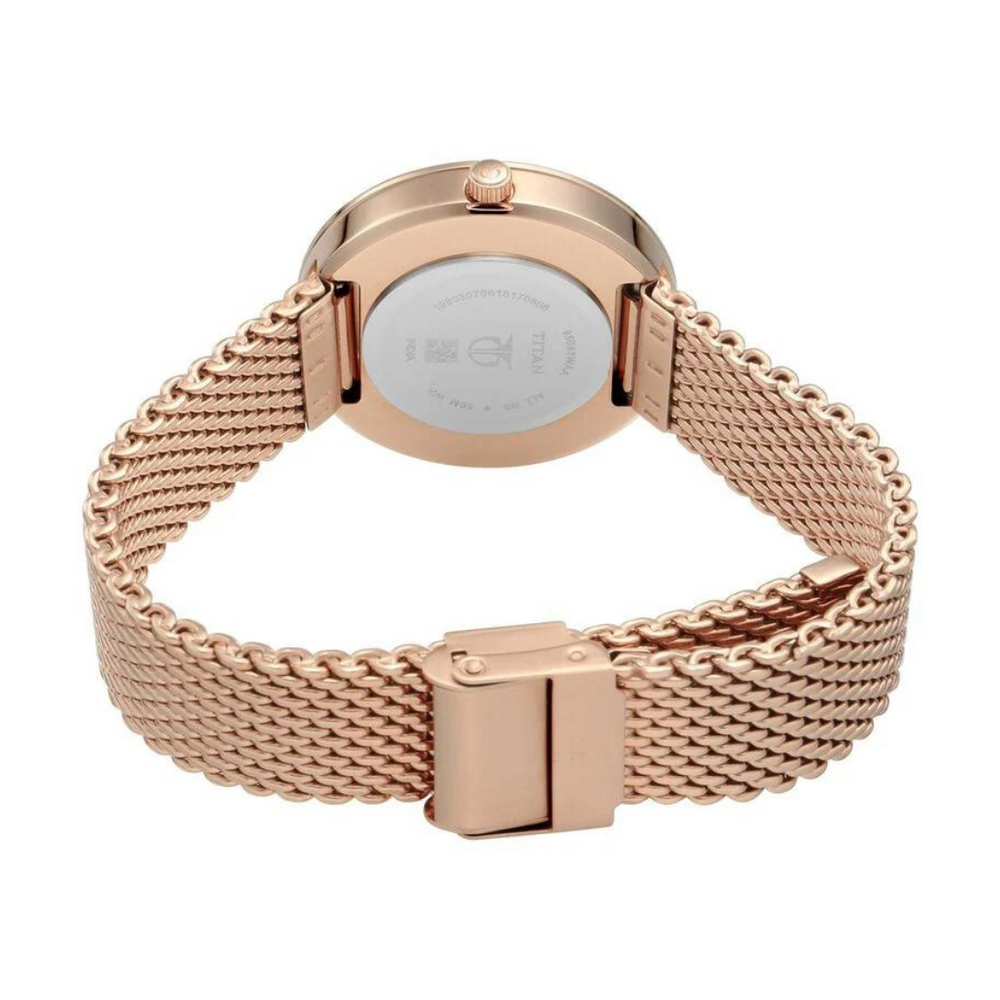 Immerse yourself in the celestial theme with this impeccable analog women's watch from Titan's Stellar collection. The mint-hued dial, crystal-embellished bezel, and Milanese rose gold-toned mesh strap create a captivating look. With crystals and glitter, it deserves a special space in your collection.