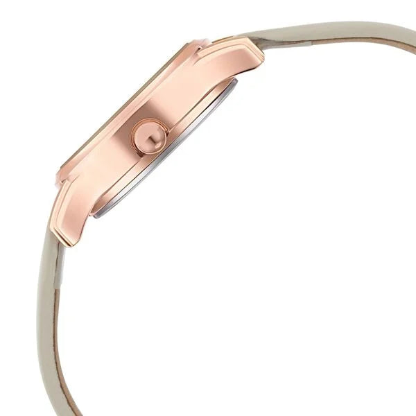 Embrace everyday sophistication with this sleek and small watch featuring a brown classic dial, dotted indices, and stone detailing. The rose gold bezel and light grey leather straps make it perfect for everyday wear. Style it with tailored trousers and a blouse for a polished and feminine look suitable for the office or casual outings.
