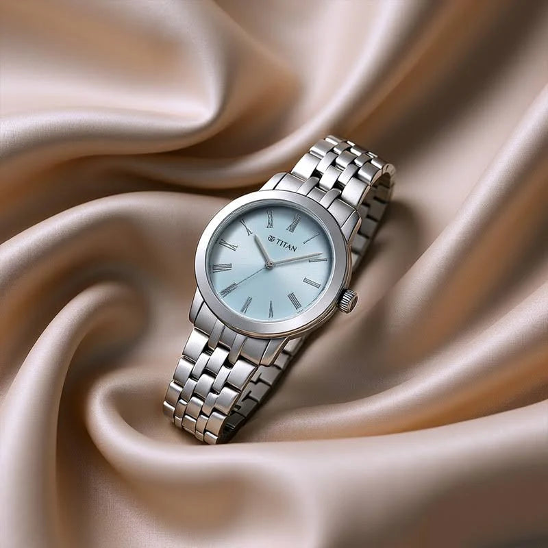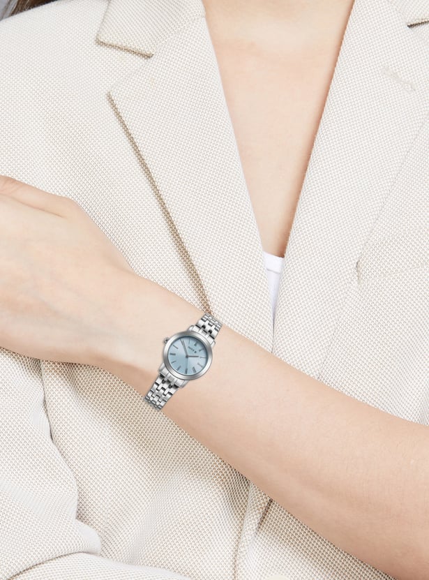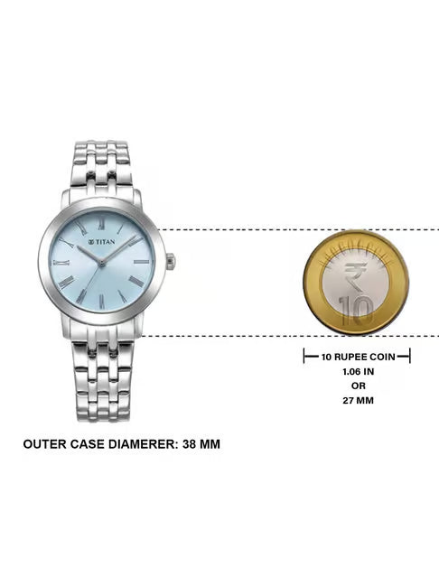 Add a classy touch to your attire by wearing this women's watch from the collection by Titan. The blue round dial is protected by a sapphire glass. It features crown for time adjustment. The stainless steel strap flaunts a silver hue that accentuates the look of the watch. Besides, it is completed with a fold-over clasp with double push button safety clasp to ensure a secure fit on the wrist.