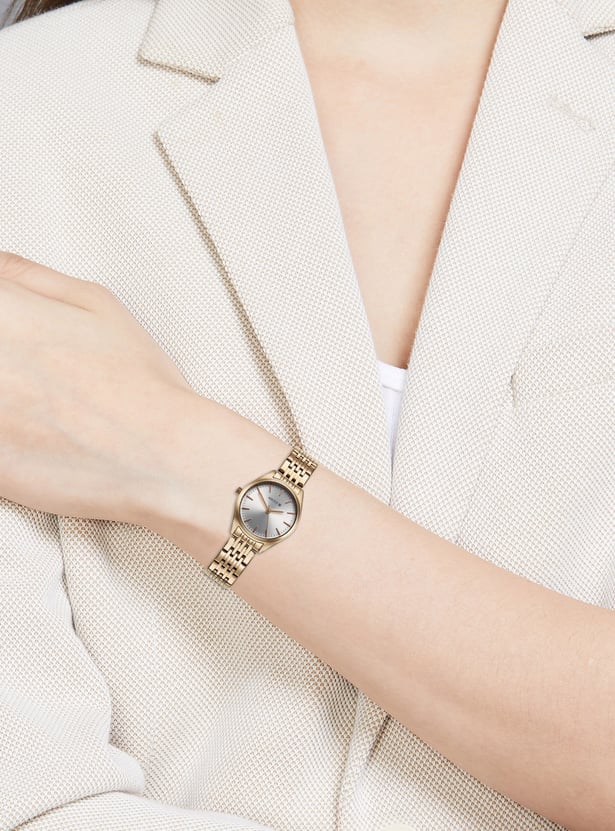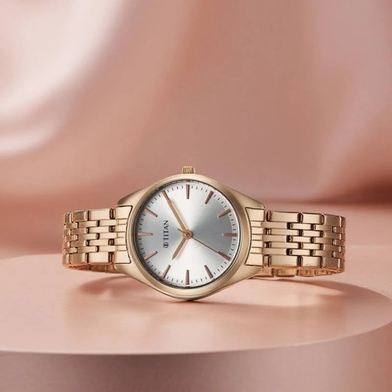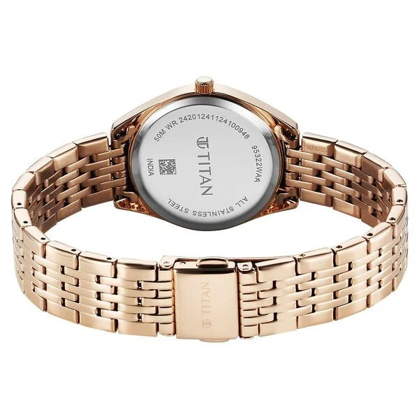 The Titan Workmode 95322WM01 is a sophisticated quartz analog watch designed for women who value both style and functionality. Featuring a sleek silver dial encased in durable stainless steel, this timepiece offers a modern yet timeless appeal. The rose gold stainless steel strap with a push-type lock mechanism adds a refined touch, ensuring secure and comfortable wear. Perfect for daily office wear or formal occasions, this watch combines elegance with practical design. It comes with a 24-month warranty on movement and 12 months on battery.