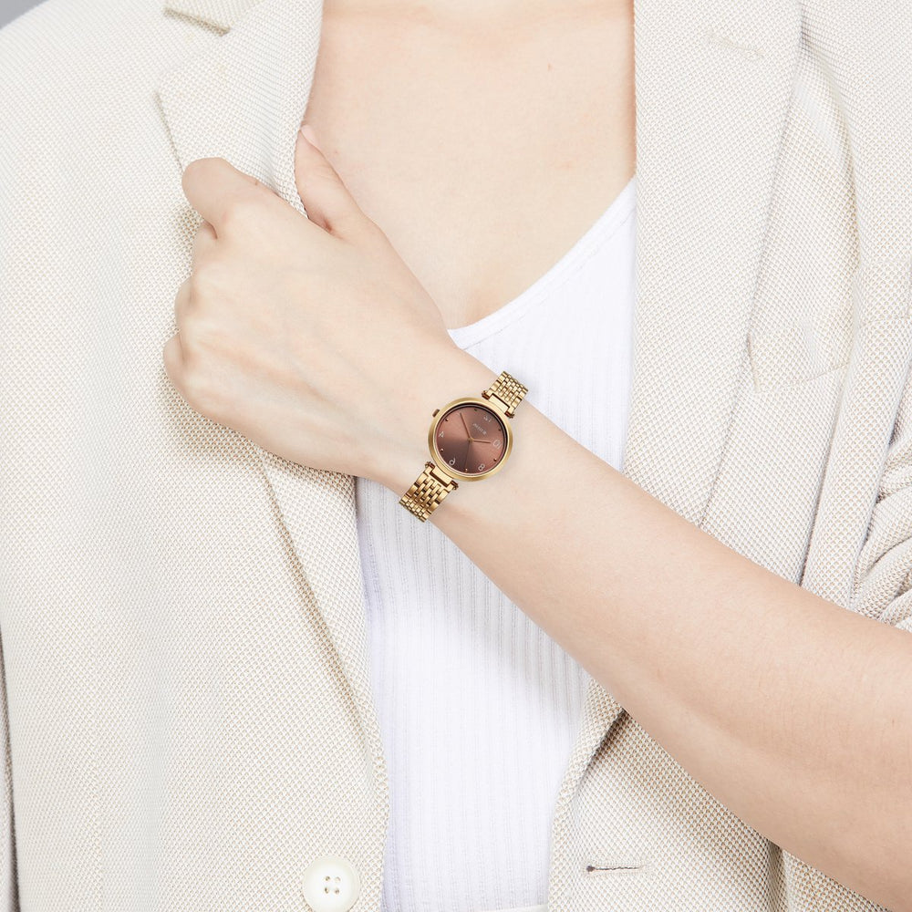 Add timeless elegance to your look with this classic analog watch. Featuring a round dial accented with beaded and Arabic numeral hour markers, it combines subtle charm with refined style. The stainless steel bracelet strap with a deployant clasp ensures a secure, polished fit. With 50m water resistance, it balances sophistication with everyday practicality.