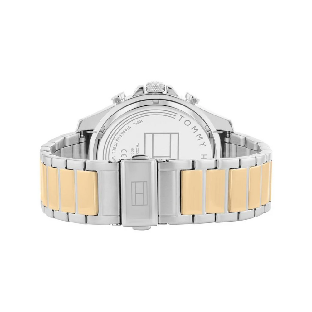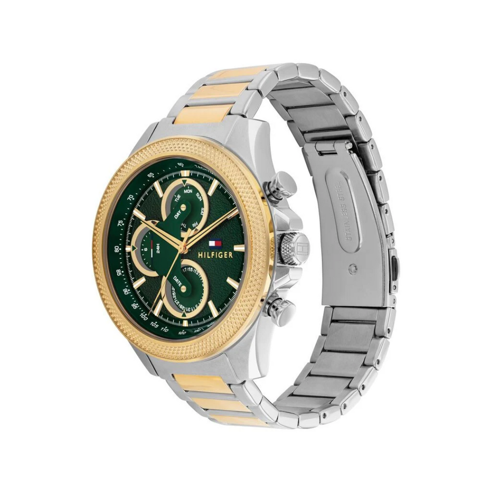 Turn heads in your surroundings with this men's analog watch from Tommy Hilfiger. Encased in a 46 mm case, the green round-shaped dial is attractive and features multifunction functionality for time adjustment. The watch works on a quartz multifunction movement. The stainless steel bracelet comes in a two tone hue that further elevates the look of the watch. Besides, it is water resistant up to 50 m m and is completed with a push button clasp to ensure a secure fit on the wrist.