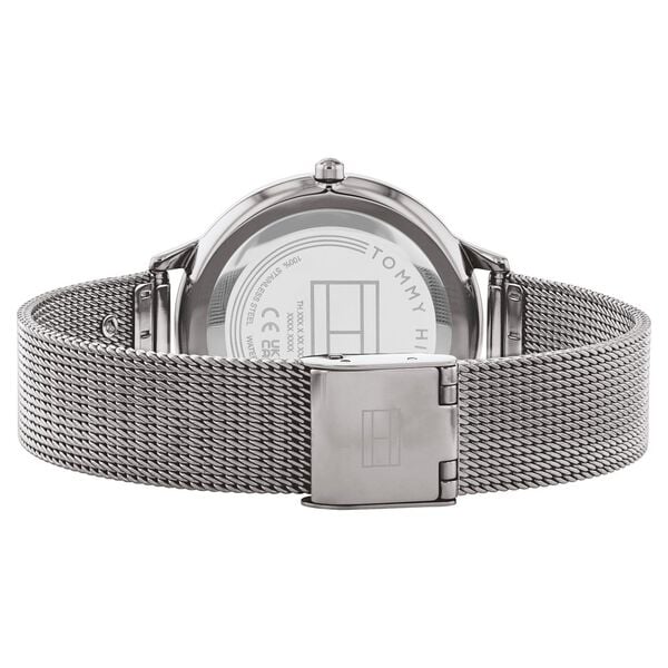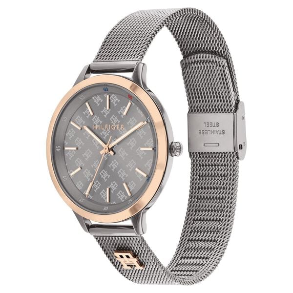Add a classy touch to your attire by wearing this women's analog watch from Tommy Hilfiger that will be a perfect pick for you. The stainless steel bracelet showcases a grey hue that uplifts the look of the watch. Safeguarded by a mineral glass and working on a quartz movement, the grey round-shaped stick dial is encompassed in a stainless steel case. It features a plain 3-hand functionality for time adjustment. It is water-resistant upto 30 m. Furthermore, it is complemented with a hook buckle clasp that ensures a secure fit on the wrist